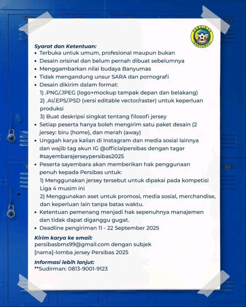 Bagi yang berminat, karya dapat dikirimkan melalui email persibasms99@gmail.com dengan subjek “[nama]-lomba jersey Persibas 2025”. Informasi lebih lanjut bisa diperoleh melalui kontak panitia, Sudirman, di nomor 0813-9001-9123.