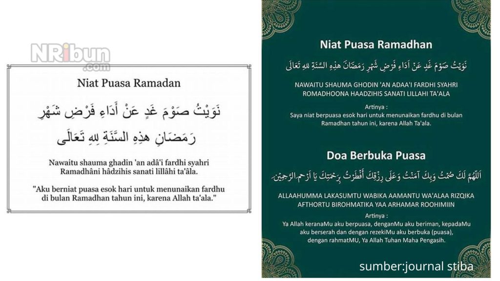 Adapun bacaan niat puasa Ramadhan yang umum digunakan oleh masyarakat Indonesia adalah sebagai berikut: Nawaitu shauma ghadin an adai fardhi syahri ramadhana hadzihis sanati lillahi taala. Arti dari doa tersebut adalah saya niat berpuasa esok hari untuk menunaikan kewajiban di bulan Ramadhan tahun ini karena Allah Taala. Selain niat harian, beberapa ulama juga memperbolehkan pembacaan niat puasa untuk satu bulan penuh pada malam pertama Ramadhan sebagai langkah antisipasi jika suatu saat seorang Muslim lupa membaca niat pada malam hari berikutnya.